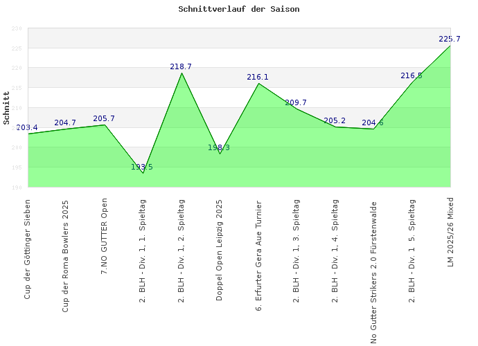 Sportjahr: 30.06.2026 Ereignis: 2. BLH - Div. 1 5. Spieltag Pins: 1299 Spiele: 6 Datum: 11.10.2025 Sportjahr: 30.06.2026 Ereignis: No Gutter Strikers 2.0 Fürstenwalde Pins: 4502 Spiele: 22 Datum: 05.10.2025 Sportjahr: 30.06.2026 Ereignis: 2. BLH - Div. 1, 4. Spieltag Pins: 1231 Spiele: 6 Datum: 28.09.2025 Sportjahr: 30.06.2026 Ereignis: 2. BLH - Div. 1, 3. Spieltag Pins: 1258 Spiele: 6 Datum: 27.09.2025 Sportjahr: 30.06.2026 Ereignis: 6. Erfurter Gera Aue Turnier Pins: 3242 Spiele: 15 Datum: 07.09.2025 Sportjahr: 30.06.2026 Ereignis: Doppel Open Leipzig 2025 Pins: 2776 Spiele: 14 Datum: 31.08.2025 Sportjahr: 30.06.2026 Ereignis: 2. BLH - Div. 1, 2. Spieltag Pins: 1312 Spiele: 6 Datum: 14.09.2025 Sportjahr: 30.06.2026 Ereignis: 2. BLH - Div. 1, 1. Spieltag Pins: 1161 Spiele: 6 Datum: 13.09.2025 Sportjahr: 30.06.2026 Ereignis: 7.NO GUTTER Open Pins: 3291 Spiele: 16 Datum: 10.08.2025 Sportjahr: 30.06.2026 Ereignis: Cup der Roma Bowlers 2025 Pins: 3684 Spiele: 18 Datum: 27.07.2025 Sportjahr: 30.06.2026 Ereignis: Cup der Göttinger Sieben Pins: 1627 Spiele: 8 Datum: 13.07.2025 Sportjahr: 30.06.2026 Ereignis: Übertrag Sportjahr 30.06.2025 Pins: 35728 Spiele: 179 Datum: 14.07.2025 Sportjahr: 30.06.2025 Ereignis: Übertrag Sportjahr 30.06.2024 Pins: 52464 Spiele: 253 Datum: 03.08.2024 Sportjahr: 30.06.2024 Ereignis: Übertrag Sportjahr 30.06.2023 Pins: 51025 Spiele: 247 Datum: 22.07.2023 Sportjahr: 30.06.2023 Ereignis: Übertrag Sportjahr 30.06.2022 Pins: 41255 Spiele: 197 Datum: 14.08.2022 Sportjahr: 30.06.2022 Ereignis: Übertrag Sportjahr 30.06.2021 Pins: 6558 Spiele: 32 Datum: 12.07.2021 Sportjahr: 30.06.2021 Ereignis: Übertrag Sportjahr 30.06.2020 Pins: 44385 Spiele: 218 Datum: 09.07.2020 Sportjahr: 30.06.2020 Ereignis: Übertrag Sportjahr 30.06.2019 Pins: 58325 Spiele: 280 Datum: 01.07.2019 Sportjahr: 30.06.2019 Ereignis: Übertrag Sportjahr 30.06.2018 Pins: 64749 Spiele: 307 Datum: 14.07.2018 Sportjahr: 30.06.2018 Ereignis: Übertrag Sportjahr 30.06.2017 Pins: 60216 Spiele: 290 Datum: 08.07.2017 Sportjahr: 30.06.2017 Ereignis: Übertrag Sportjahr 30.06.2016 Pins: 46787 Spiele: 230 Datum: 01.07.2016 Sportjahr: 30.06.2016 Ereignis: Übertrag Sportjahr 30.06.2015 Pins: 52512 Spiele: 263 Datum: 01.07.2015 Sportjahr: 30.06.2015 Ereignis: Übertrag Sportjahr 30.06.2014 Pins: 31972 Spiele: 155 Datum: 01.07.2014 Sportjahr: 30.06.2014 Ereignis: Übertrag Sportjahr 30.06.2013 Pins: 26147 Spiele: 129 Datum: 01.07.2013 Sportjahr: 30.06.2013 Ereignis: Übertrag Sportjahr 30.06.2012 Pins: 38026 Spiele: 188 Datum: 01.07.2012 Sportjahr: 30.06.2012 Ereignis: Übertrag Sportjahr 30.06.2011 Pins: 34473 Spiele: 176 Datum: 22.07.2011 Sportjahr: 30.06.2011 Ereignis: Übertrag Sportjahr 30.06.2010 Pins: 43168 Spiele: 214 Datum: 07.08.2010 Sportjahr: 30.06.2010