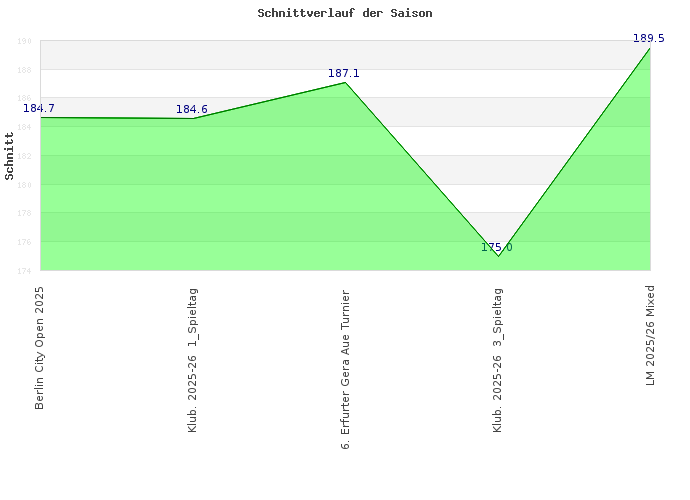 Sportjahr: 30.06.2026 Ereignis: Klub. 2025-26 3_Spieltag Pins: 700 Spiele: 4 Datum: 19.10.2025 Sportjahr: 30.06.2026 Spieltag: 3_Spieltag Liga: SL Staffel: 2 Ereignis: 6. Erfurter Gera Aue Turnier Pins: 2619 Spiele: 14 Datum: 07.09.2025 Sportjahr: 30.06.2026 Ereignis: Klub. 2025-26 1_Spieltag Pins: 923 Spiele: 5 Datum: 30.08.2025 Sportjahr: 30.06.2026 Spieltag: 1_Spieltag Liga: SL Staffel: 2 Ereignis: Berlin City Open 2025 Pins: 1108 Spiele: 6 Datum: 20.08.2025 Sportjahr: 30.06.2026 Ereignis: Übertrag Sportjahr 30.06.2025 Pins: 11568 Spiele: 62 Datum: 14.07.2025 Sportjahr: 30.06.2025 Ereignis: Übertrag Sportjahr 30.06.2024 Pins: 21021 Spiele: 114 Datum: 03.08.2024 Sportjahr: 30.06.2024 Ereignis: Übertrag Sportjahr 30.06.2023 Pins: 17359 Spiele: 97 Datum: 22.07.2023 Sportjahr: 30.06.2023 Ereignis: Übertrag Sportjahr 30.06.2022 Pins: 14624 Spiele: 78 Datum: 14.08.2022 Sportjahr: 30.06.2022 Ereignis: Übertrag Sportjahr 30.06.2021 Pins: 5265 Spiele: 30 Datum: 12.07.2021 Sportjahr: 30.06.2021 Ereignis: Übertrag Sportjahr 30.06.2020 Pins: 15617 Spiele: 80 Datum: 09.07.2020 Sportjahr: 30.06.2020 Ereignis: Übertrag Sportjahr 30.06.2019 Pins: 20962 Spiele: 114 Datum: 01.07.2019 Sportjahr: 30.06.2019 Ereignis: Übertrag Sportjahr 30.06.2018 Pins: 15909 Spiele: 87 Datum: 14.07.2018 Sportjahr: 30.06.2018 Ereignis: Übertrag Sportjahr 30.06.2017 Pins: 12902 Spiele: 72 Datum: 08.07.2017 Sportjahr: 30.06.2017 Ereignis: Übertrag Sportjahr 30.06.2016 Pins: 8494 Spiele: 53 Datum: 01.07.2016 Sportjahr: 30.06.2016 Ereignis: Übertrag Sportjahr 30.06.2015 Pins: 7742 Spiele: 49 Datum: 01.07.2015 Sportjahr: 30.06.2015 Ereignis: Übertrag Sportjahr 30.06.2014 Pins: 11946 Spiele: 70 Datum: 01.07.2014 Sportjahr: 30.06.2014 Ereignis: Übertrag Sportjahr 30.06.2013 Pins: 9835 Spiele: 63 Datum: 01.07.2013 Sportjahr: 30.06.2013 Ereignis: Übertrag Sportjahr 30.06.2012 Pins: 8501 Spiele: 58 Datum: 01.07.2012 Sportjahr: 30.06.2012 Ereignis: Übertrag Sportjahr 30.06.2011 Pins: 6834 Spiele: 54 Datum: 22.07.2011 Sportjahr: 30.06.2011