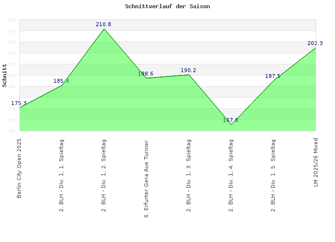 Sportjahr: 30.06.2026 Ereignis: 2. BLH - Div. 1 5. Spieltag Pins: 1125 Spiele: 6 Datum: 11.10.2025 Sportjahr: 30.06.2026 Ereignis: 2. BLH - Div. 1, 4. Spieltag Pins: 839 Spiele: 5 Datum: 28.09.2025 Sportjahr: 30.06.2026 Ereignis: 2. BLH - Div. 1, 3. Spieltag Pins: 951 Spiele: 5 Datum: 27.09.2025 Sportjahr: 30.06.2026 Ereignis: 6. Erfurter Gera Aue Turnier Pins: 4150 Spiele: 22 Datum: 07.09.2025 Sportjahr: 30.06.2026 Ereignis: 2. BLH - Div. 1, 2. Spieltag Pins: 1265 Spiele: 6 Datum: 14.09.2025 Sportjahr: 30.06.2026 Ereignis: 2. BLH - Div. 1, 1. Spieltag Pins: 1112 Spiele: 6 Datum: 13.09.2025 Sportjahr: 30.06.2026 Ereignis: Berlin City Open 2025 Pins: 2104 Spiele: 12 Datum: 20.08.2025 Sportjahr: 30.06.2026 Ereignis: Übertrag Sportjahr 30.06.2025 Pins: 22881 Spiele: 120 Datum: 14.07.2025 Sportjahr: 30.06.2025 Ereignis: Übertrag Sportjahr 30.06.2024 Pins: 21244 Spiele: 109 Datum: 03.08.2024 Sportjahr: 30.06.2024 Ereignis: Übertrag Sportjahr 30.06.2023 Pins: 19546 Spiele: 105 Datum: 22.07.2023 Sportjahr: 30.06.2023 Ereignis: Übertrag Sportjahr 30.06.2022 Pins: 12177 Spiele: 65 Datum: 14.08.2022 Sportjahr: 30.06.2022 Ereignis: Übertrag Sportjahr 30.06.2021 Pins: 6546 Spiele: 36 Datum: 12.07.2021 Sportjahr: 30.06.2021 Ereignis: Übertrag Sportjahr 30.06.2020 Pins: 18697 Spiele: 104 Datum: 09.07.2020 Sportjahr: 30.06.2020 Ereignis: Übertrag Sportjahr 30.06.2019 Pins: 27329 Spiele: 149 Datum: 01.07.2019 Sportjahr: 30.06.2019 Ereignis: Übertrag Sportjahr 30.06.2018 Pins: 10397 Spiele: 55 Datum: 14.07.2018 Sportjahr: 30.06.2018 Ereignis: Übertrag Sportjahr 30.06.2017 Pins: 19334 Spiele: 114 Datum: 08.07.2017 Sportjahr: 30.06.2017 Ereignis: Übertrag Sportjahr 30.06.2016 Pins: 14690 Spiele: 91 Datum: 01.07.2016 Sportjahr: 30.06.2016 Ereignis: Übertrag Sportjahr 30.06.2015 Pins: 6788 Spiele: 45 Datum: 01.07.2015 Sportjahr: 30.06.2015 Ereignis: Übertrag Sportjahr 30.06.2014 Pins: 5522 Spiele: 38 Datum: 01.07.2014 Sportjahr: 30.06.2014 Ereignis: Übertrag Sportjahr 30.06.2013 Pins: 6256 Spiele: 44 Datum: 01.07.2013 Sportjahr: 30.06.2013