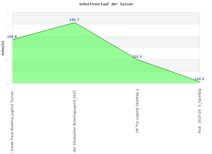 Sportjahr: 30.06.2026 Ereignis: Trials der Deutschen Bowlingjugend 2025 Pins: 2486 Spiele: 15 Datum: 21.09.2025 Sportjahr: 30.06.2026 Ereignis: 33. FC Sankt Pauli Bowling Jugend Turnier Pins: 2220 Spiele: 14 Datum: 07.09.2025 Sportjahr: 30.06.2026 Ereignis: Übertrag Sportjahr 30.06.2025 Pins: 9466 Spiele: 67 Datum: 14.07.2025 Sportjahr: 30.06.2025 Ereignis: Übertrag Sportjahr 30.06.2024 Pins: 9313 Spiele: 66 Datum: 03.08.2024 Sportjahr: 30.06.2024 Ereignis: Übertrag Sportjahr 30.06.2023 Pins: 4588 Spiele: 35 Datum: 22.07.2023 Sportjahr: 30.06.2023