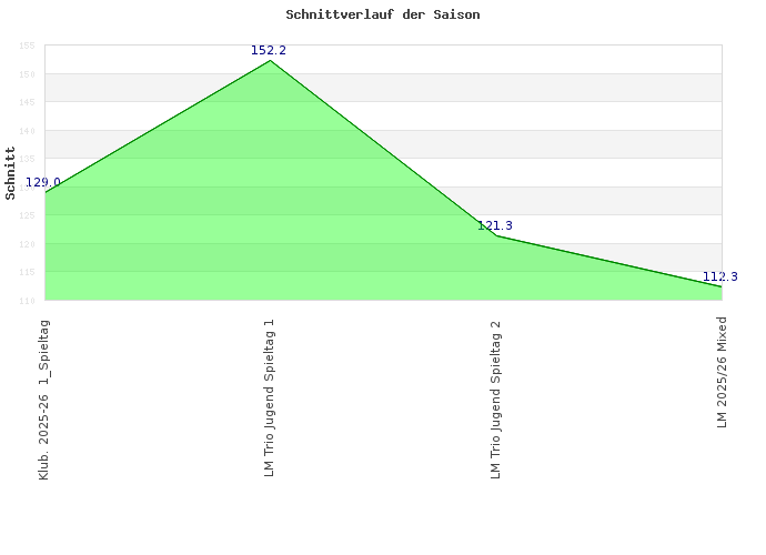 Sportjahr: 30.06.2026 Ereignis: LM Trio Jugend Spieltag 2 Pins: 728 Spiele: 6 Datum: 27.09.2025 Sportjahr: 30.06.2026 Ereignis: LM Trio Jugend Spieltag 1 Pins: 913 Spiele: 6 Datum: 06.09.2025 Sportjahr: 30.06.2026 Ereignis: Klub. 2025-26 1_Spieltag Pins: 387 Spiele: 3 Datum: 17.08.2025 Sportjahr: 30.06.2026 Spieltag: 1_Spieltag Liga: SL Staffel: 1 Ereignis: Übertrag Sportjahr 30.06.2025 Pins: 5588 Spiele: 48 Datum: 14.07.2025 Sportjahr: 30.06.2025